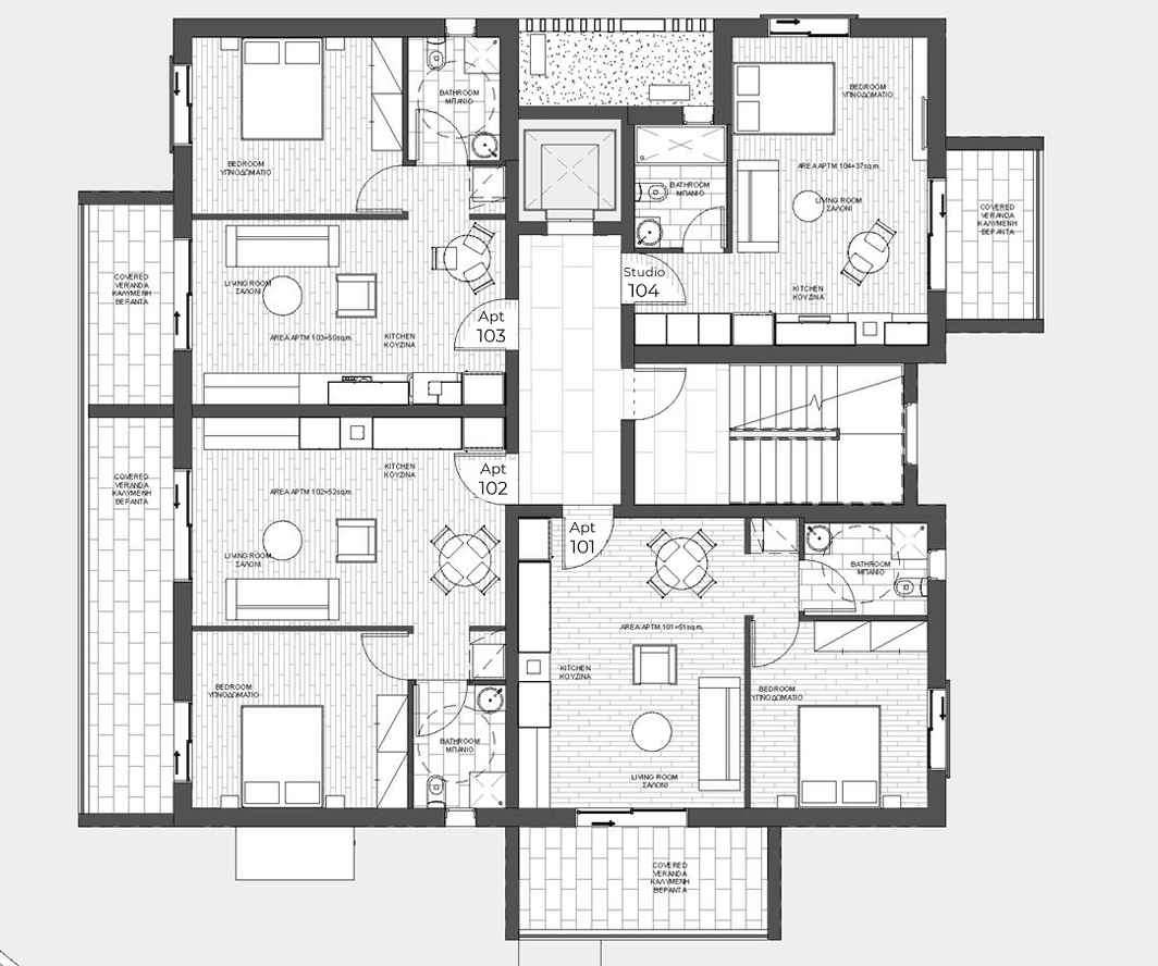Na pierwszym piętrze znajduje się przytulny apartament o powierzchni 57 m², zaprojektowany z myślą o komforcie i funkcjonalności. Lokal 103 to idealna propozycja dla osób, które chcą mieszkać w centrum Pafos, korzystając z nowoczesnych rozwiązań i bliskości miejskiej infrastruktury.