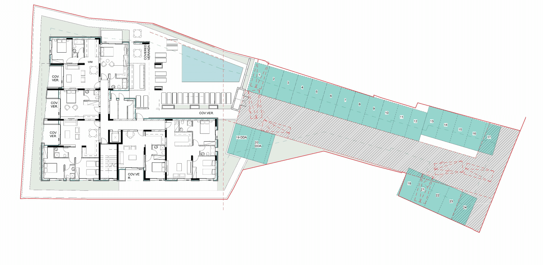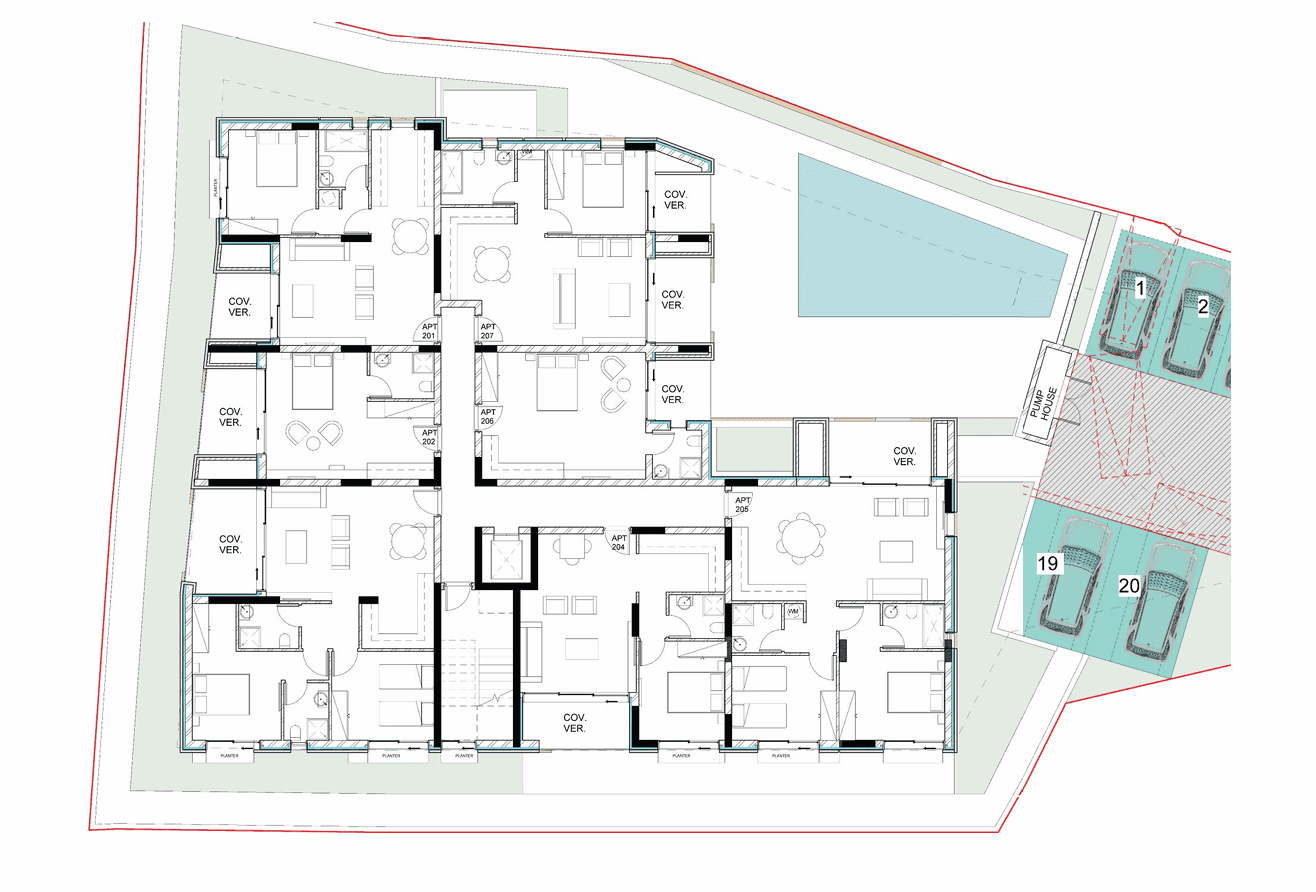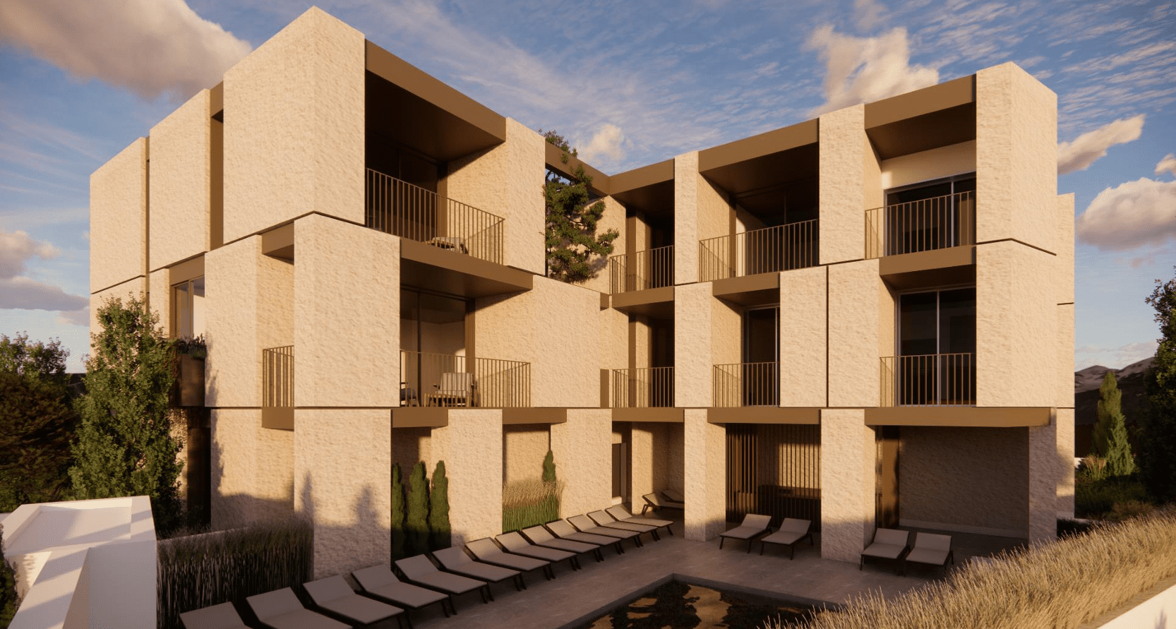 Budynek obejmuje 20 starannie zaprojektowanych mieszkań rozmieszczonych na trzech kondygnacjach – od funkcjonalnych kawalerek, przez komfortowe apartamenty z jedną sypialnią, po przestronne mieszkania dwupokojowe. Każda jednostka została zaprojektowana z myślą o maksymalnym wykorzystaniu światła dziennego i ergonomii przestrzeni.